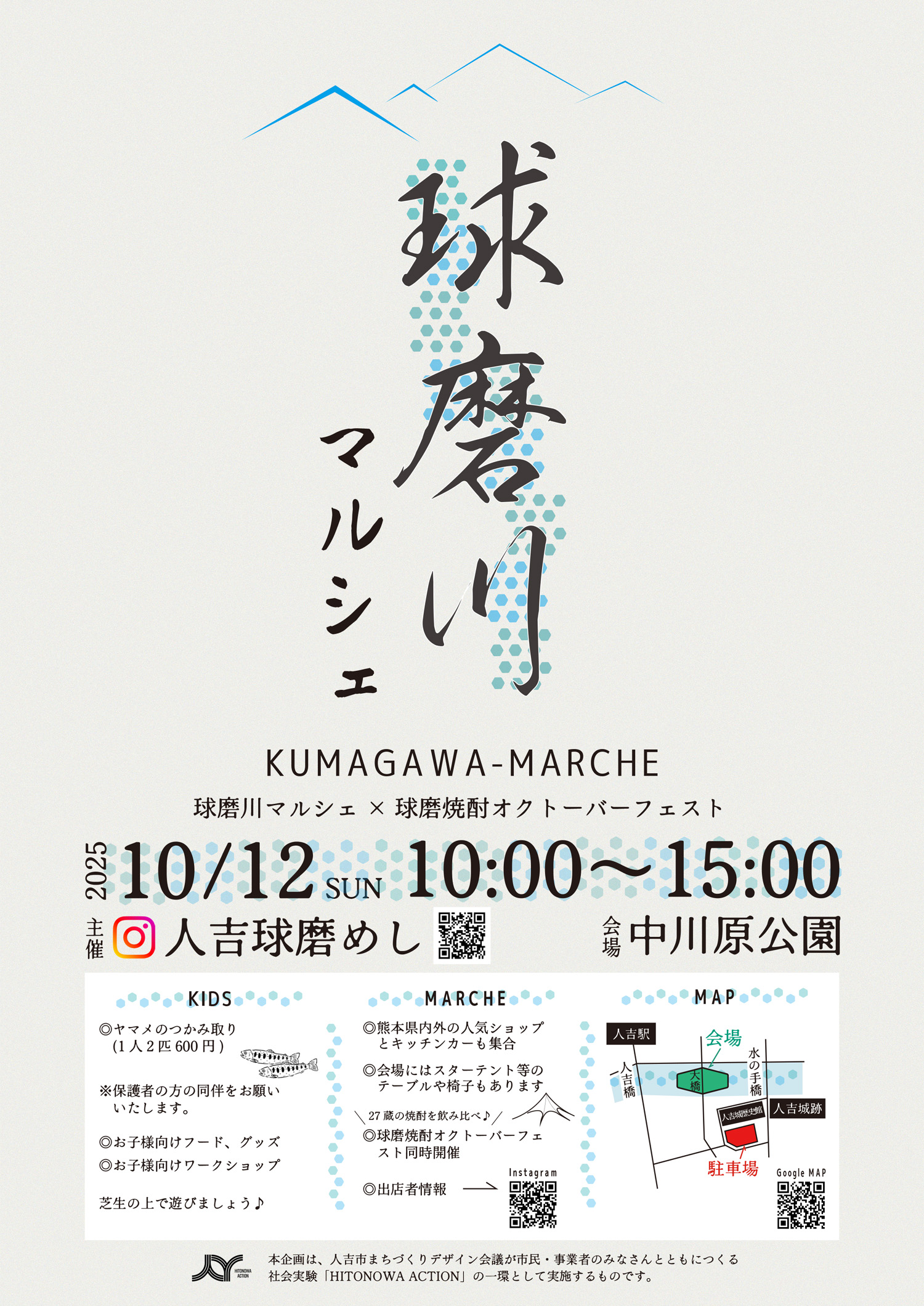 人気グルメアカウント「人吉球磨めし」が主催するマルシェイベント。ヤマメのつかみ取りや子ども向けのワークショップ、キッチンカーなどが人吉市の中川原公園に集結します。